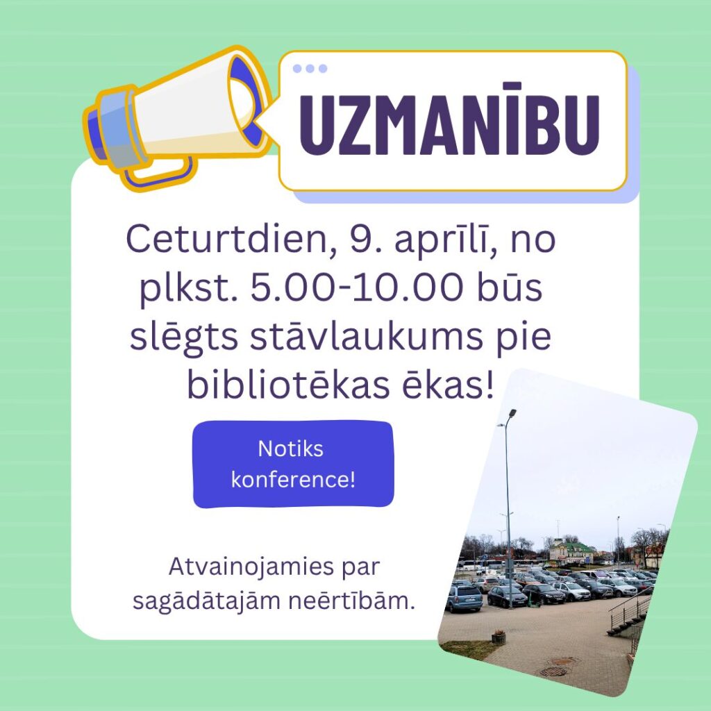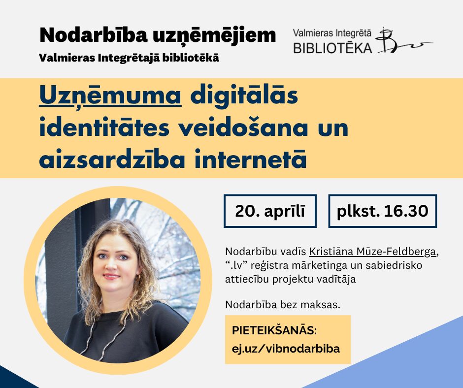 E-KATALOGS REĢISTRĀCIJA VIDEO PALĪGS eGRĀMATAS PASĀKUMI APMĀCĪBAS Jaunumi Visas jaunākās grāmatas Marta grāmatu jaunumi Grāmatu jaunumi Bērnu apkalpošanas nodaļā Ērika Šmeļkova - Slepenā aģente Fifī Anita Rupeika - Labrīt, mammu! Jana Hoha - Rubīna loks. Visas mūsu patiesības Aktualitātes Visas aktualitātes Kultūra Valmieras Integrētās bibliotēkas apmeklētāji novērtē galda spēļu pieejamību 09.04.2026 Lekcija Aicinām uz bezmaksas nodarbībām Valmieras Integrētajā bibliotēkā 07.04.2026 Kultūra Ar Atzinības krustu apbalvos Valmieras bibliotēkas direktori Daigu Rokpelni 05.04.2026 Izmaiņas 9. aprīlī uz laiku būs slēgts bibliotēkas stāvlaukums 04.04.2026 Bērni un jaunieši Noslēdzies grāmatu BINGO “BINGOBOLS”! 01.04.2026 Izstāde Izstādes Valmieras novada bibliotēkās aprīlī 01.04.2026 Tuvākie notikumi Radošā darbnīca Rokdarbu klubiņš Norises datums: 09.04.2026 Kocēnu apvienība Tikšanās ar personību ATCELTS! Tikšanās ar grāmatas “Mana Dienas grāmata. Ēvalds Siliņš” autori Līgu Siliņu Norises datums: 10.04.2026 Mazsalacas apvienība Radošā darbnīca Ziepju stāstu darbnīca Norises datums: 11.04.2026 Kocēnu apvienība Radošā darbnīca Adīšanas entuziastu grupas “Adām kopā” kārtējā nodarbība Norises datums: 11.04.2026 Kocēnu apvienība Norišu kalendārs Visas norises Foto un video galerija