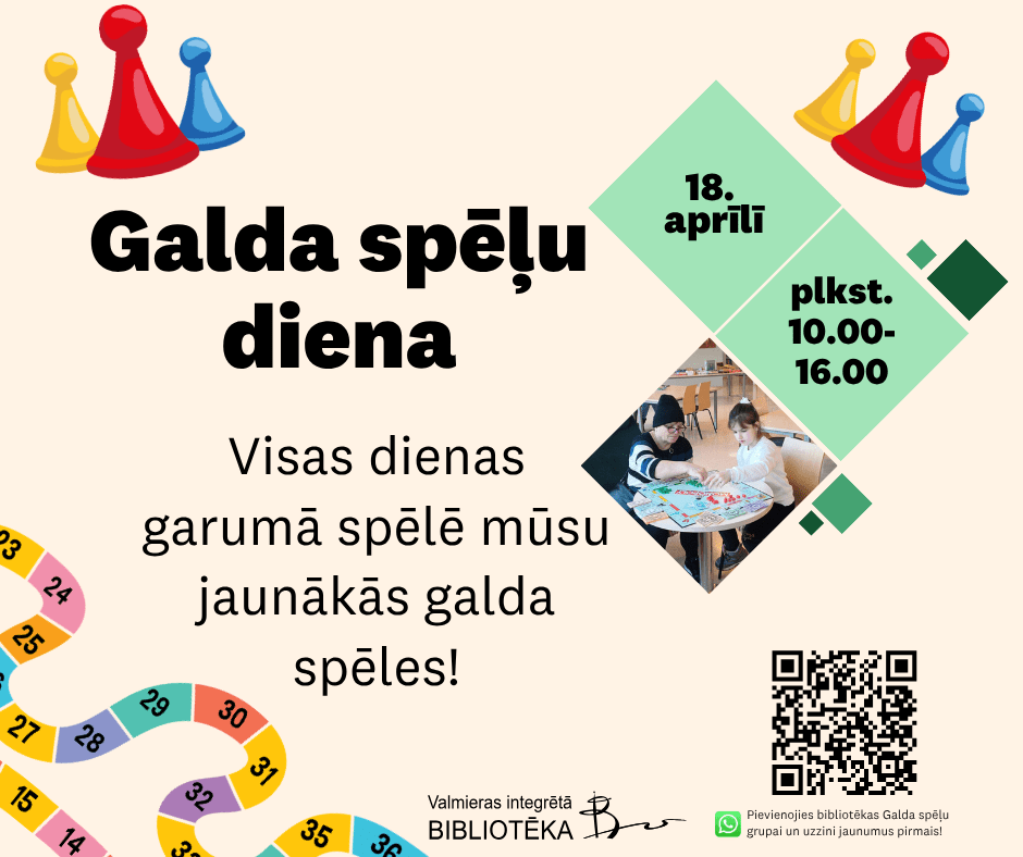 E-KATALOGS REĢISTRĀCIJA VIDEO PALĪGS eGRĀMATAS PASĀKUMI APMĀCĪBAS Jaunumi Visas jaunākās grāmatas Marta grāmatu jaunumi Grāmatu jaunumi Bērnu apkalpošanas nodaļā Ērika Šmeļkova - Slepenā aģente Fifī Anita Rupeika - Labrīt, mammu! Jana Hoha - Rubīna loks. Visas mūsu patiesības Aktualitātes Visas aktualitātes Bērni un jaunieši Ģimeņu rīts "Drošība" kopā ar VUGD un autoskolu "Lauris S" 16.04.2026 Projekts “Zaļstāsts” saved kopā jauniešus, literātus un vides ekspertus 14.04.2026 Tikšanās ar personību Aicinām uz tikšanos ar rakstnieci Ēriku Šmeļkovu 14.04.2026 Kultūra Valmieras Integrētās bibliotēkas apmeklētāji novērtē galda spēļu pieejamību 09.04.2026 Lekcija Aicinām uz bezmaksas nodarbībām Valmieras Integrētajā bibliotēkā 07.04.2026 Bērni un jaunieši Noslēdzies grāmatu BINGO “BINGOBOLS”! 05.04.2026 Tuvākie notikumi Radošā darbnīca SATIEC SAVU MEISTARU 2026! Ķoņos Norises datums: 19.04.2026 Naukšēnu apvienība Radošā darbnīca Meistarklase – Skalu grozu pīšana Norises datums: 19.04.2026 Burtnieku apvienība Lekcija Droša iepirkšanās internetā Norises datums: 20.04.2026 Valmiera Lekcija Uzņēmuma digitālās identitātes veidošana un aizsardzība Norises datums: 20.04.2026 Valmiera Norišu kalendārs Visas norises Foto un video galerija