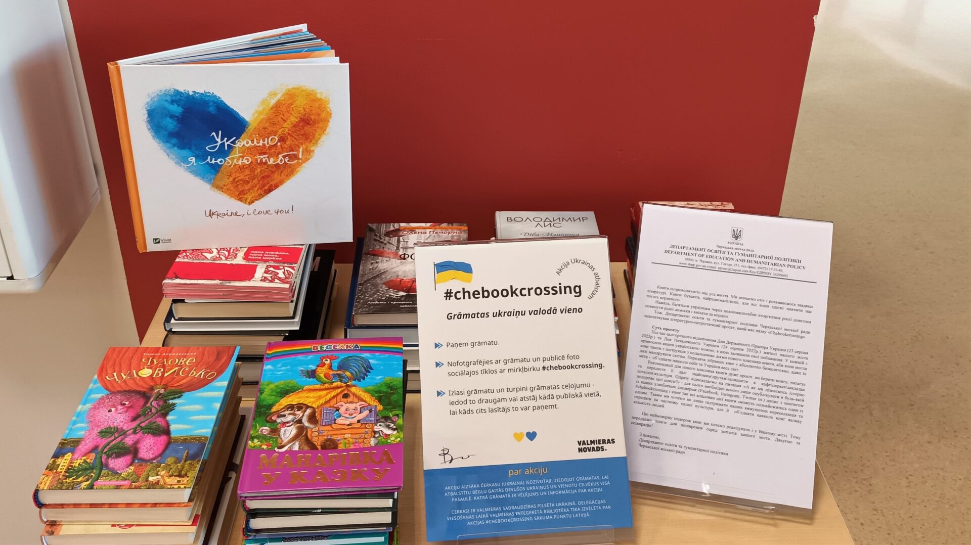 Valmieras Integrētās bibliotēkas 1. stāvā izvietots akcijas #chebookcrossing grāmatu galds ar grāmatām ukraiņu valodā. Šīs grāmatas Ukrainas pilsētas Čerkasu delegācija atveda uz Valmieru ar aicinājumu iesaistīties grāmatu ceļojumos pie ukraiņiem, kas piespiedu kārtā atstājuši savu valsti un šobrīd dzīvo ārpus Ukrainas.