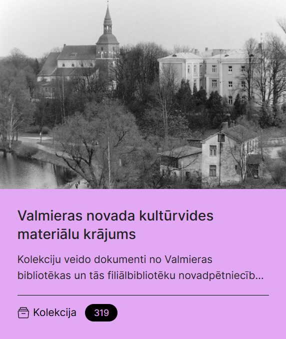 Digitālās bibliotēkas platformā tagad pieejams Valmieras novada kultūrvides materiālu krājums. Kolekciju veido dokumenti no Valmieras bibliotēkas un tās filiālbibliotēku novadpētniecības krājuma, kā arī sadarbības partneru kolekcijām un privātpersonu arhīviem.