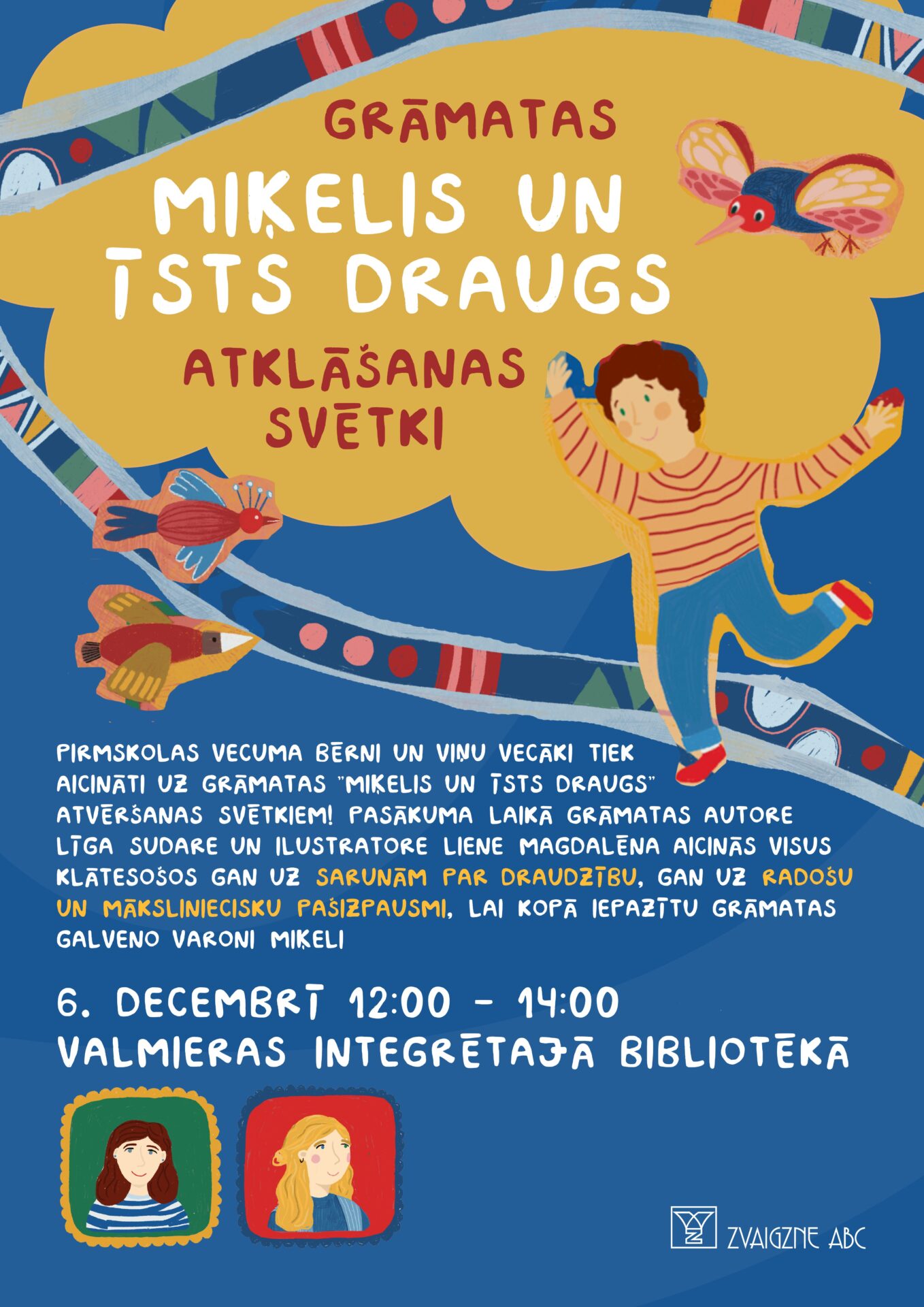 6. decembrī plkst. 12.00 Valmieras Integrētajā bibliotēkā, Bērnu apkalpošanas nodaļā, pirmsskolas vecuma bērni un viņu vecāki tiek aicināti uz grāmatas “Miķelis un īsts draugs” atvēršanas svētkiem. Pasākuma laikā grāmatas autore Līga Sudare un ilustratore Liene Magdalēna aicinās visus klātesošos gan uz sarunām par draudzību, gan uz radošu un māksliniecisku pašizpausmi, lai kopā iepazītu grāmatas galveno varoni Miķeli.