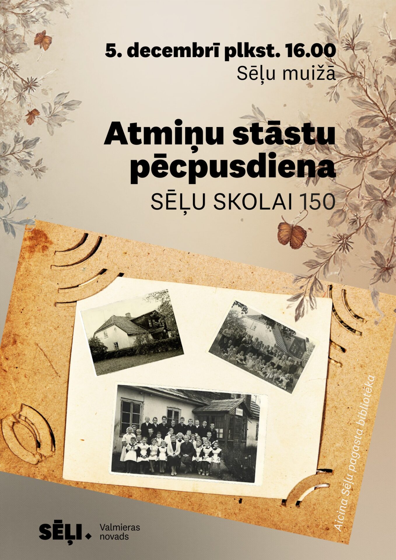 5. decembrī plkst. 16.00 Sēļu pagasta bibliotēka aicina “Sēļu muižas” zaļajā zālē uz atmiņu stāstu pēcpusdienu “Sēļu skolai 150”. Informācija pa tālr. nr. 26582985.