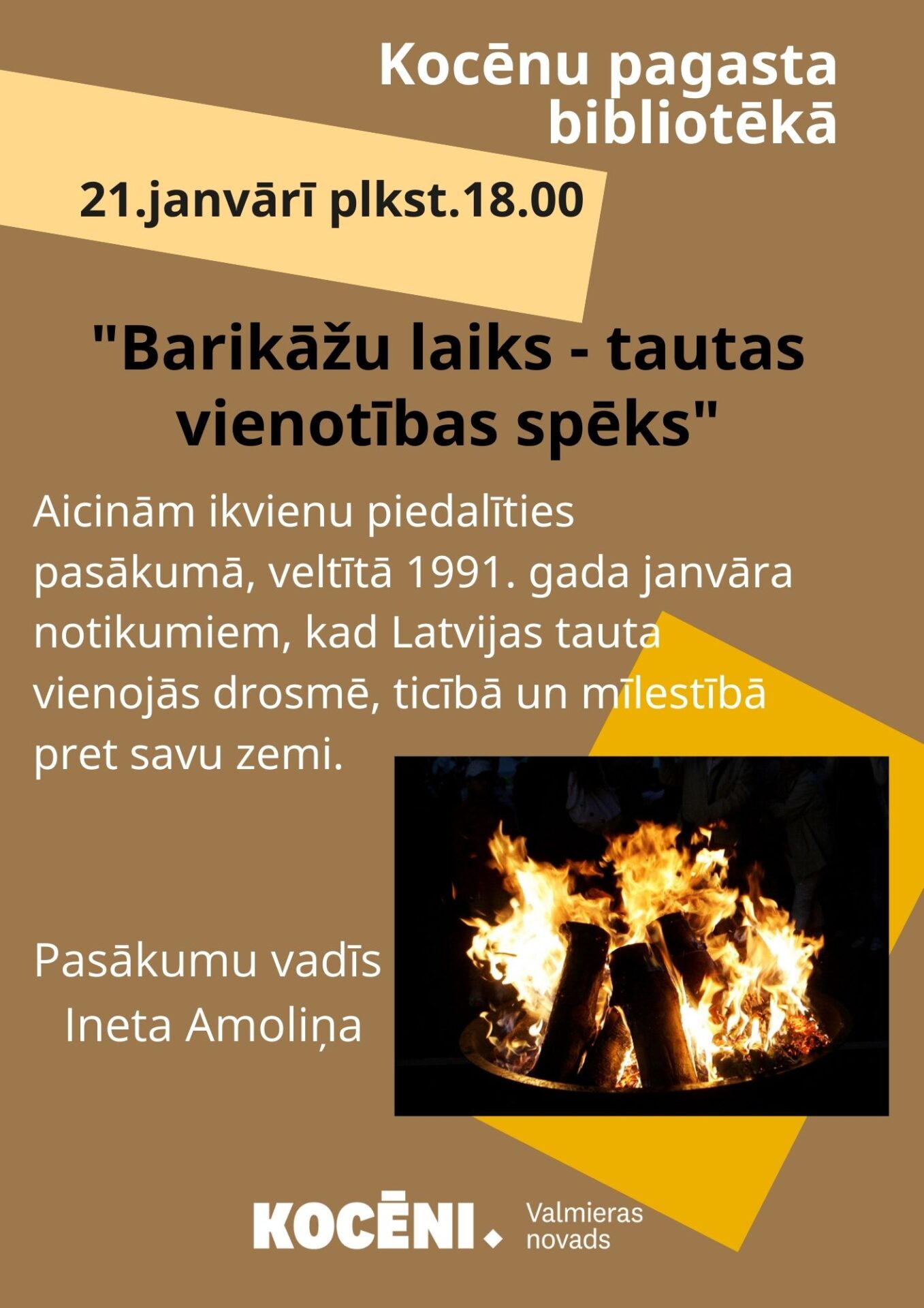 21. janvārī plkst. 18.00 Kocēnu pagasta bibliotēkā Barikāžu atceres pasākums “Barikādēm 35”. Pasākumu vadīs vēsturniece Ineta Amoliņa.