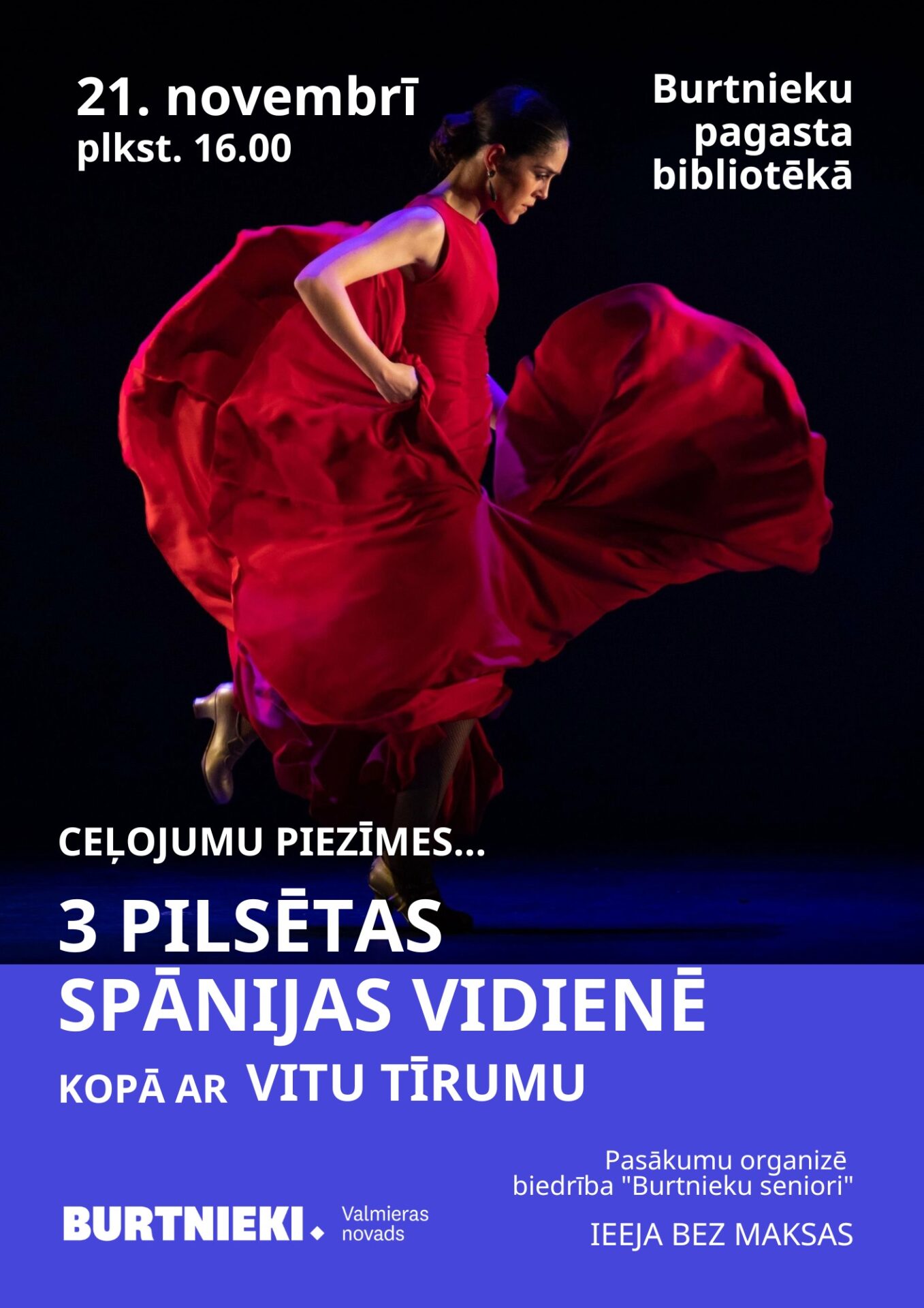 21. novembrī plkst. 16.00 Burtnieku pagasta bibliotēkā ceļojumu stāsts “Trīs pilsētas Spānijas vidienē” kopā ar Vitu Tīrumu. Ieeja bez maksas. Pasākumu organizē biedrība “Burtnieku seniori”.