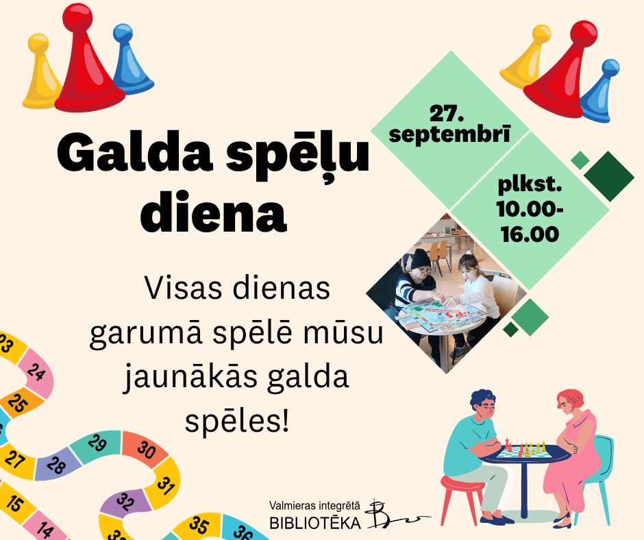 27. septembrī no plkst. 10.00 līdz 16.00 Valmieras Integrētajā bibliotēkā galda spēļu diena. Aicinām spēlēt bibliotēkas krājumā esošās galda spēles gan bērniem, gan pieaugušajiem.