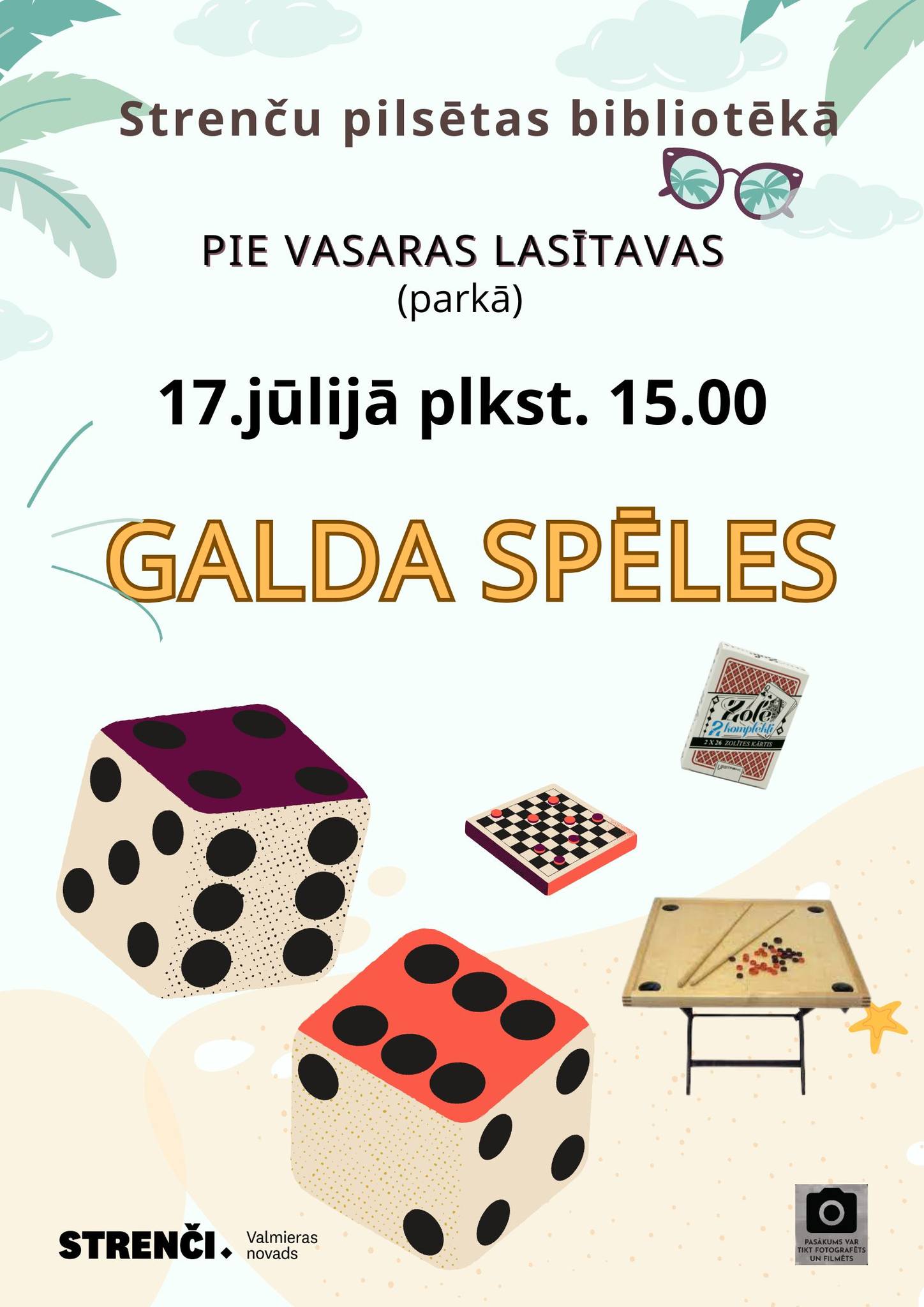 Galda spēļu pēcpusdiena Norises datums: 17.07.2025 17. jūlijā plkst. 15.00 Strenču pilsētas bibliotēkas vasaras lasītavā galda spēļu pēcpusdiena lieliem un maziem.