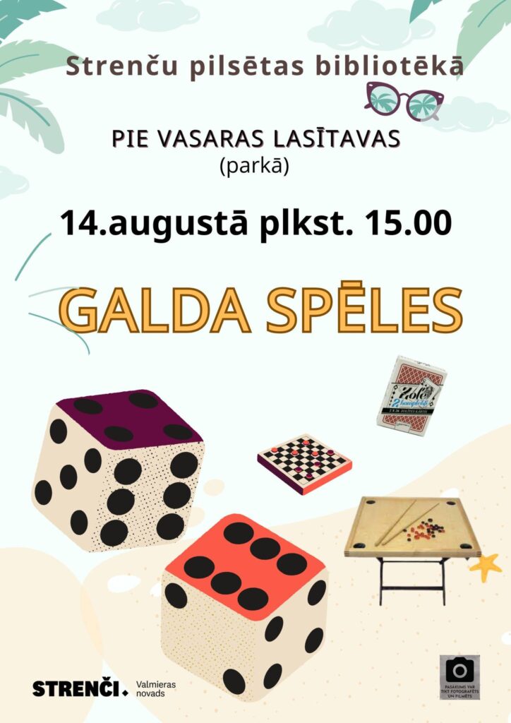 Galda spēļu pēcpusdiena lieliem un maziem Norises datums: 14.08.2025 14. augustā plkst. 15.00 Strenču pilsētas bibliotēkas vasaras lasītavā galda spēļu pēcpusdiena lieliem un maziem.