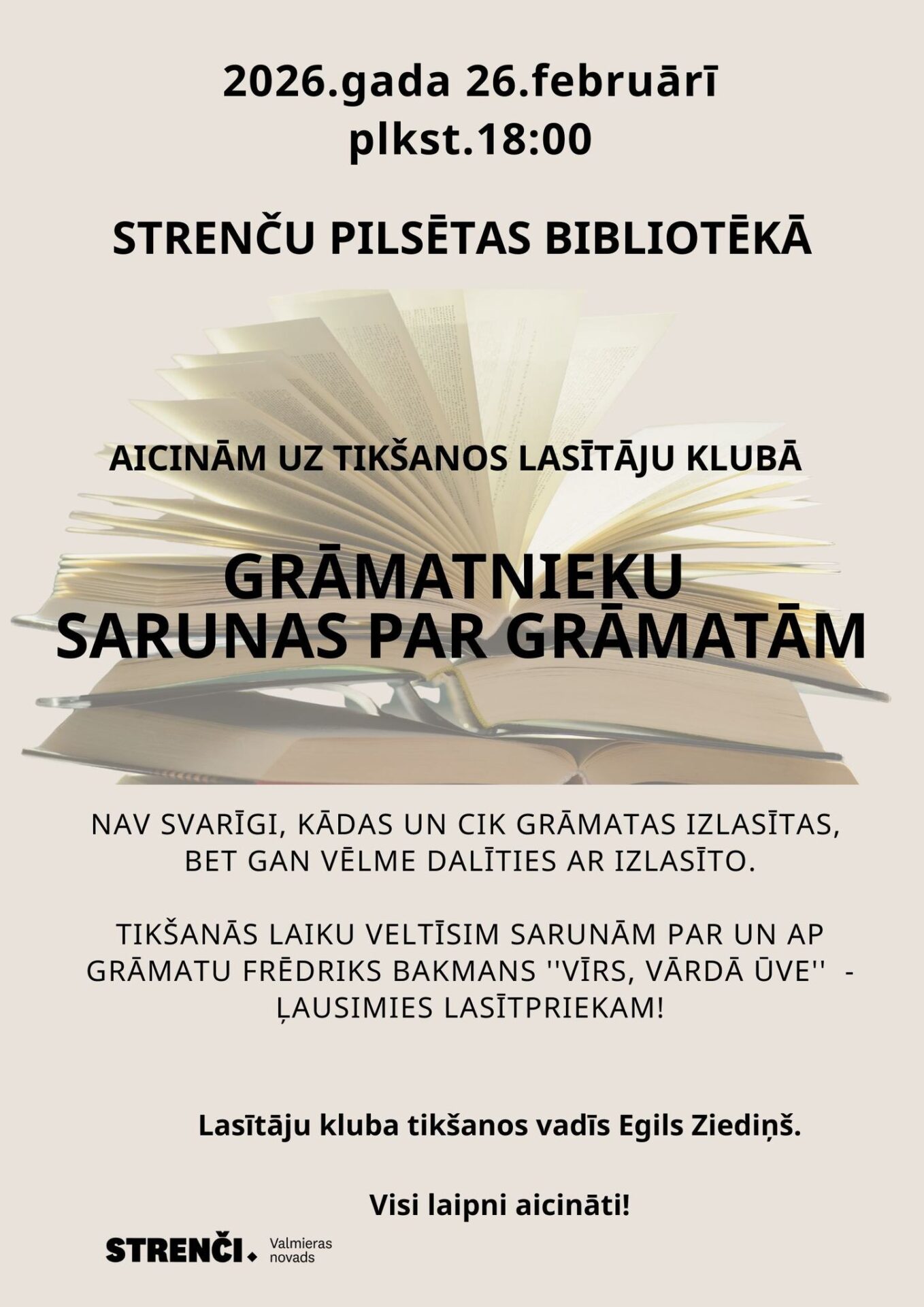 Grāmatnieku sarunas par grāmatām Norises datums: 26.02.2026 26. februārī plkst. 18.00 Strenču pilsētas bibliotēkā tikšanās lasītāju klubā “Grāmatnieku sarunas par grāmatām”. Visi laipni aicināti!