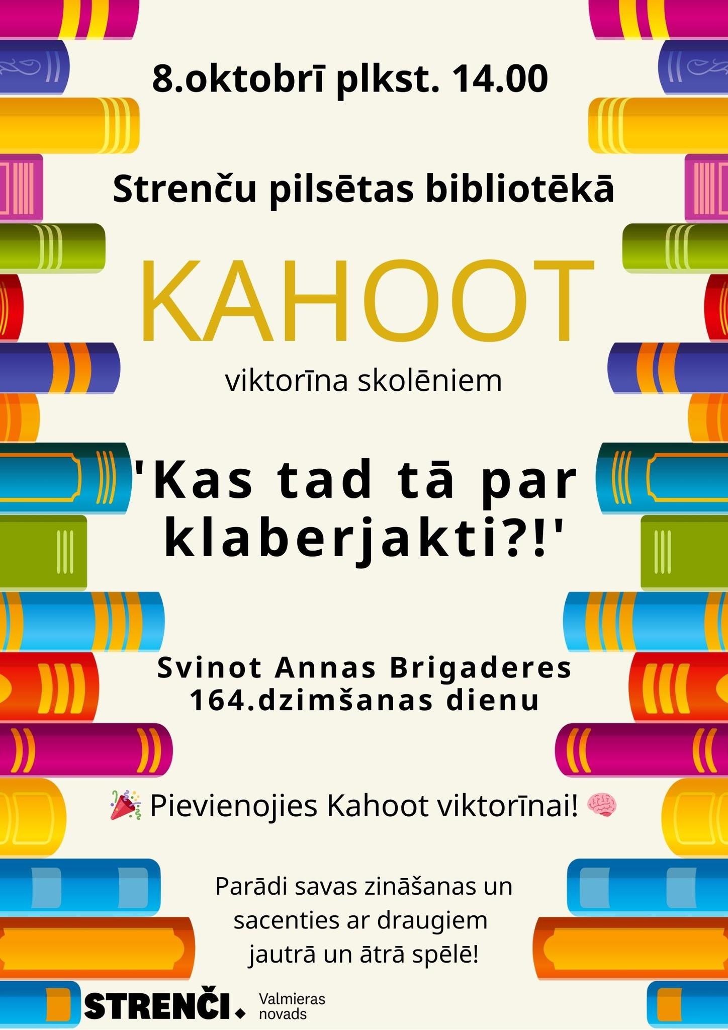 8. oktobrī plkst. 14.00 Strenču pilsētas bibliotēkā Kahoot viktorīna skolēniem “Kas tad tā par klaberjakti?!”, svinot Annas Brigaderes 164. dzimšanas dienu.
