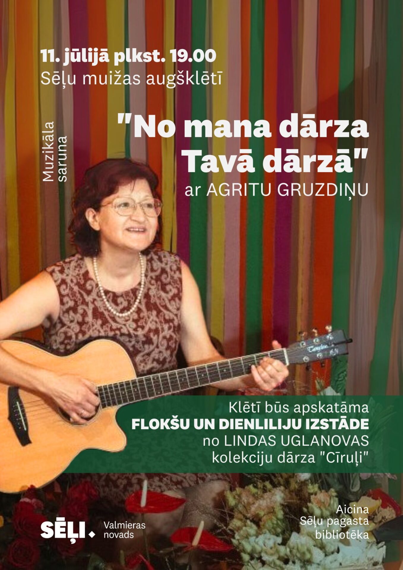 11. jūlijā plkst. 19.00 Sēļu pagasta bibliotēka aicina uz muzikālo sarunu “No mana dārza Tavā dārzā“ ar Agritu Gruzdiņu Sēļu muižas augšklētī. Būs apskatāma arī flokšu un dienliliju izstāde no Lindas Uglanovas kolekciju dārza “Cīruļi”.