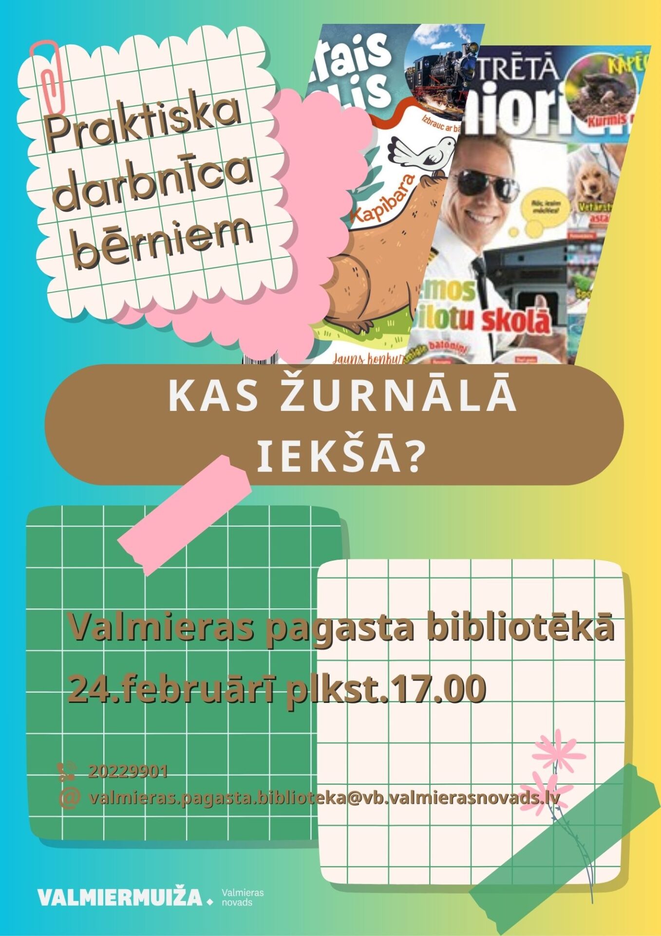 Nodarbība bērniem “Kas žurnālā iekšā?” Norises datums: 24.02.2026 24. februārī plkst. 17.00 Valmieras pagasta bibliotēkā aizraujoša nodarbība 7 – 10 gadus veciem bērniem “Kas žurnālā iekšā?”.