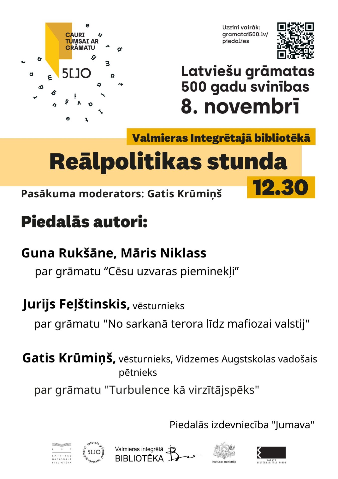 - Plkst. 12.30- 14.00 Reālpolitikas stunda. Piedalās autori: Māris Niklass, Guna Rukšāne par grāmatu “Cēsu uzvaras pieminekļi”, vēsturnieks Jurijs Feļštinskis par grāmatu “No sarkanā terora līdz mafiozai valstij”, vēsturnieks, Vidzemes Augstskolas vadošais pētnieks Gatis Krūmiņš par grāmatu “Turbulence kā virzītājspēks”. Piedalās izdevniecība “Jumava”.