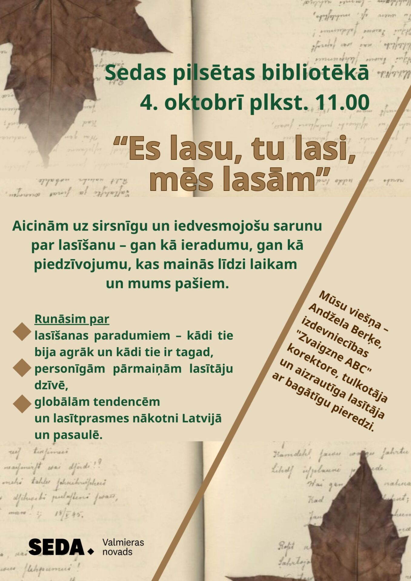 4. oktobrī plkst. 11.00 Sedas pilsētas bibliotēkā pasākums “Es lasu, Tu lasi, mēs lasām”. Aicinām uz sarunu par lasīšanu – gan kā ieradumu, gan kā piedzīvojumu, kas mainās līdzi laikam un mums pašiem. Viesis – Andžela Berķe, izdevniecības “Zvaigzne ABC” korektore, tulkotāja un aizrautīga lasītāja ar bagātīgu pieredzi.