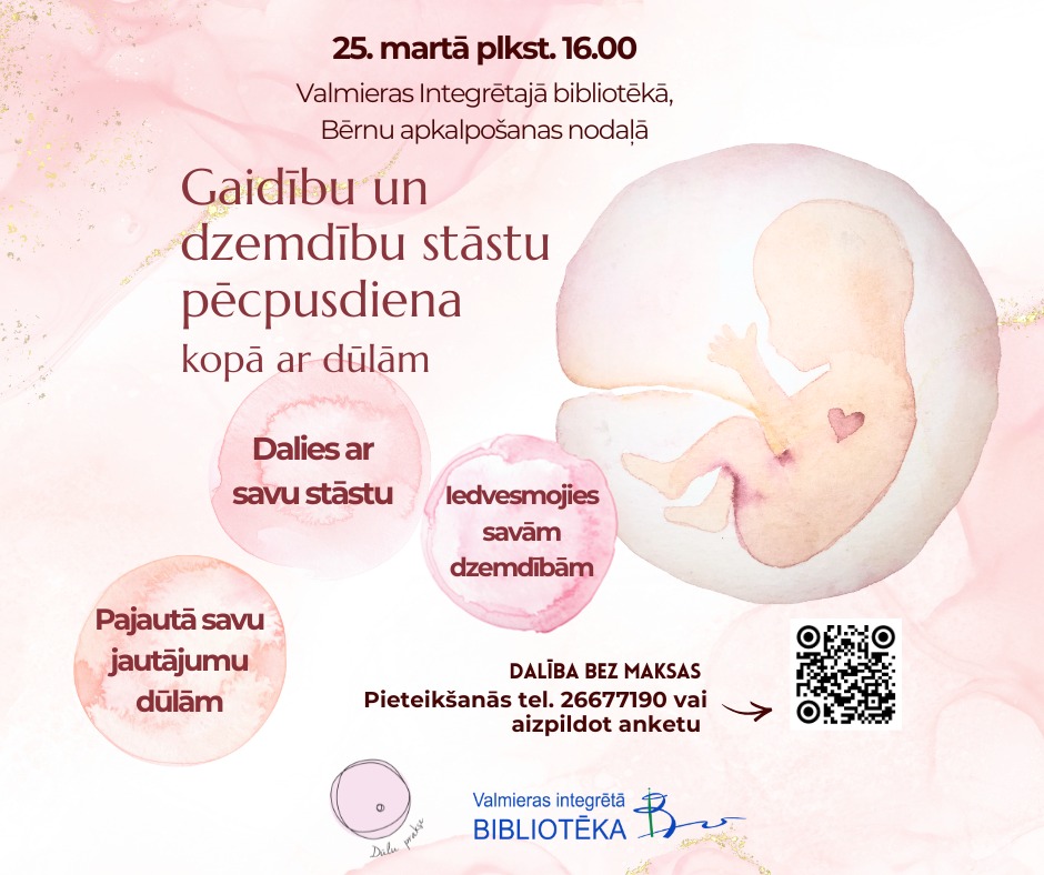 25. martā plkst. 16.00 Valmieras Integrētajā bibliotēkā, Bērnu apkalpošanas nodaļā, norisināsies pasākums “Gaidību un dzemdību stāstu pēcpusdiena”. Pasākumā gaidītas gan topošās māmiņas un tēti, gan māmiņas un tēti ar mazulīšiem.