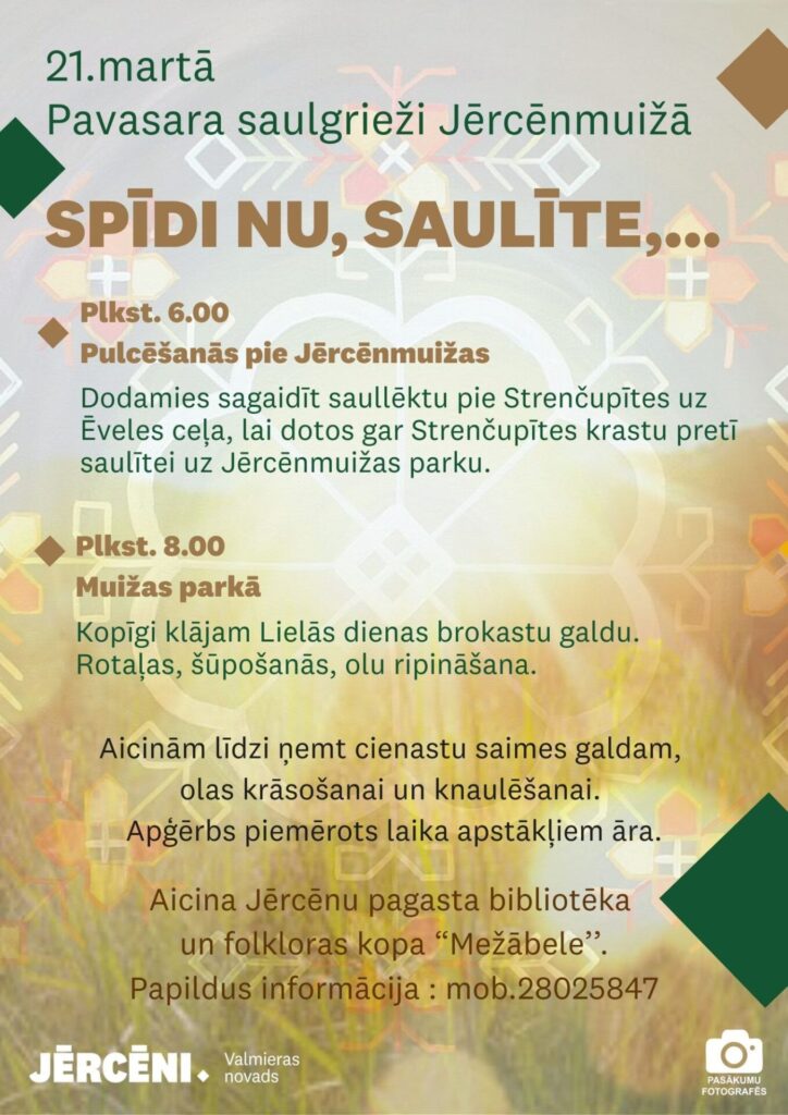 21. martā no plkst. 6.00 Jērcēnmuižā Pavasara saulgrieži kopā ar folkloras kopu “Mežābele”. Plkst. 6.00 pulcēšanās pie Jērcēnmuižas, plkst. 6.15 saullēkta sagaidīšana pie Strenčupītes uz Ēveles ceļa un gājiens uz Jērcēnmuižu gar upītes krastu, savukārt plkst 8.00 aktivitātes Jērcēnmuižas parkā.