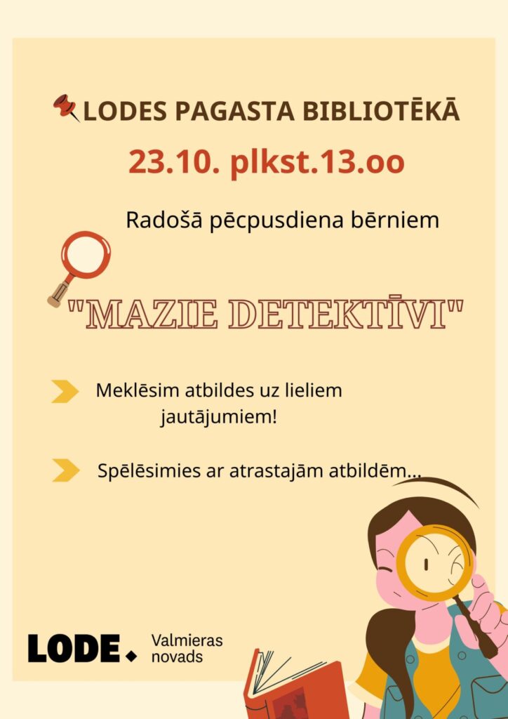 23. oktobrī plkst. 13.00 Lodes pagasta bibliotēkā radošā darbnīca bērniem “Mazie detektīvi”. Uzdosim lielus jautājumus un atbildes meklēsim grāmatās, atrastās atbildes attēlosim zīmējumu vai stāstu formā.