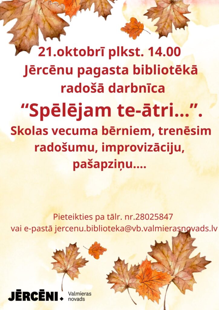 21. oktobrī plkst. 14.00 Jērcēnu pagasta bibliotēkā radošā darbnīca bērniem “Spēlējam te-ātri… radošums, improvizācija, pašapziņa”. Pieteikšanās bibliotēkā, zvanot pa tālr. nr. 28025847 vai rakstot uz e-pastu jercenu.biblioteka@vb.valmierasnovads.lv.