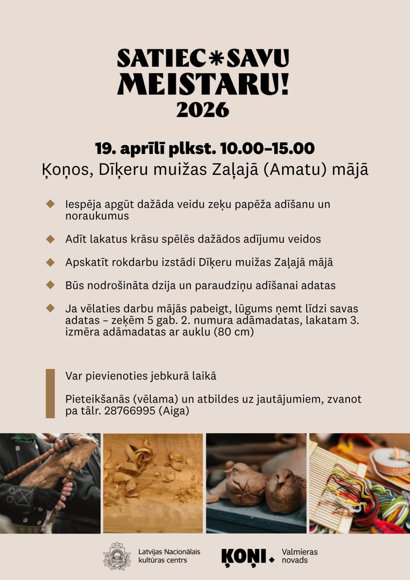 19. aprīlī no plkst. 10.00 līdz 15.00 Dīķeru muižas Zaļajā (Amatu) mājā “SATIEC SAVU MEISTARU 2026! Ķoņos”