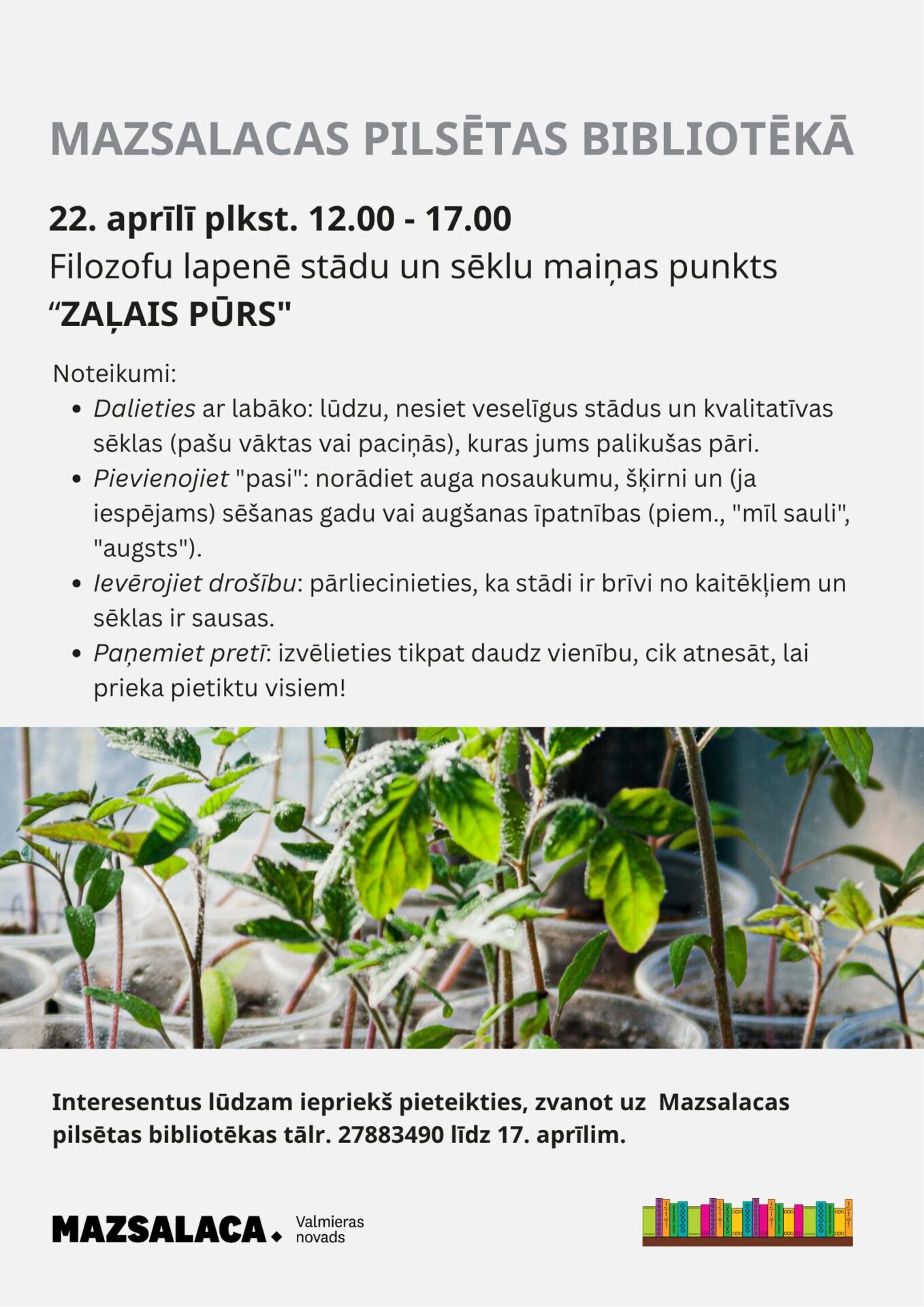 22. aprīlī no plkst. 12.00 līdz 17.00 Filozofu lapenē pie Mazsalacas pilsētas bibliotēkas Bibliotēku nedēļas ietvaros stādu un sēklu maiņas punkts “Zaļais pūrs”.