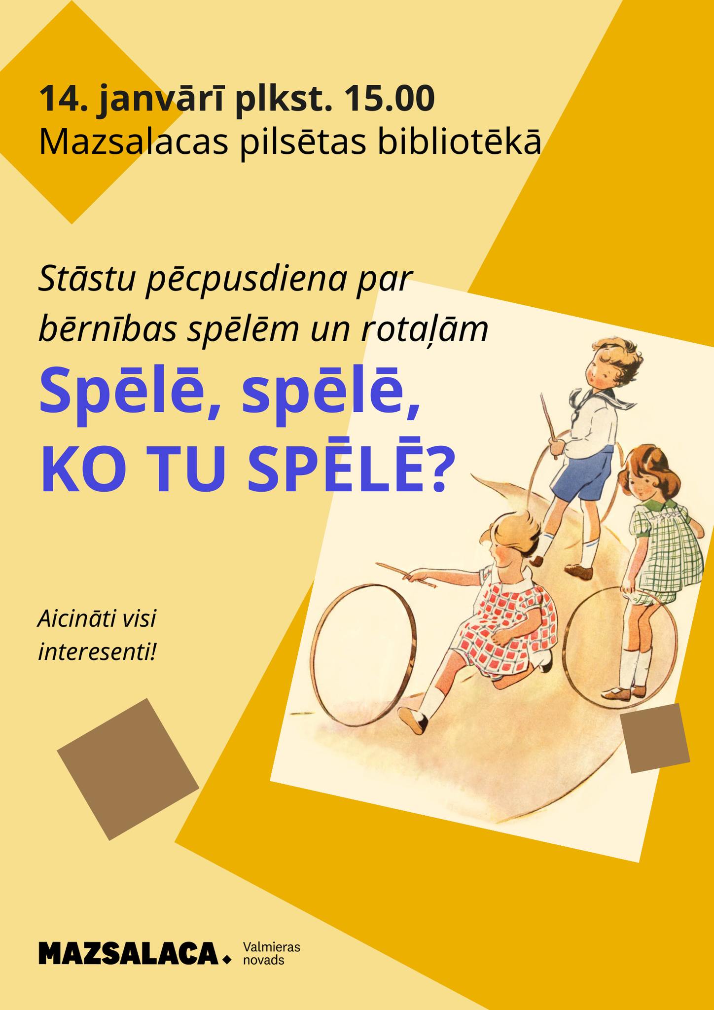 14. janvārī plkst. 15.00 Mazsalacas pilsētas bibliotēka aicina uz stāstnieku kopas tikšanos. Tēma “Spēlē, spēlē, ko tu spēlē?” Aicināti visi interesenti!