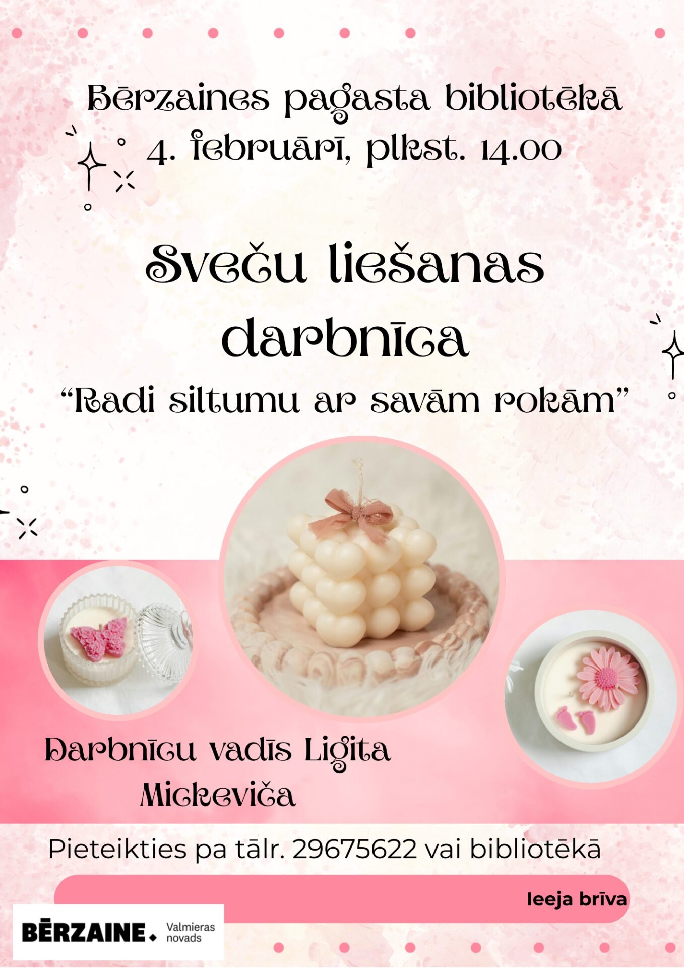 4. februārī plkst. 14.00 Bērzaines pagasta bibliotēkā sveču liešanas darbnīca “Radi siltumu ar savām rokām”. Darbnīcu vadīs Ligita Mickeviča. Pieteikšanās pa tālruņa numuru 29675622 vai klātienē bibliotēkā.