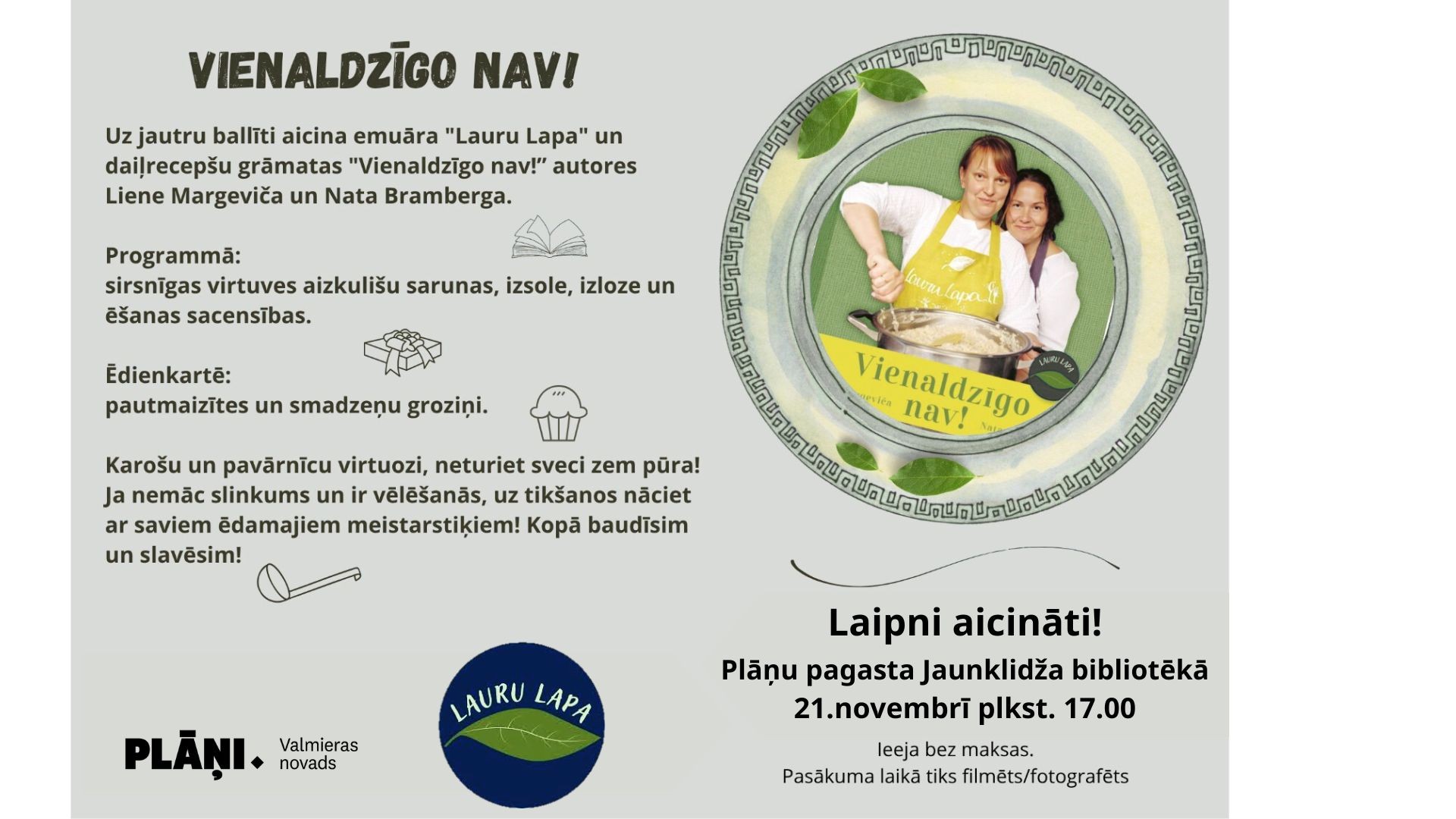 21. novembrī plkst. 17.00 Plāņu pagasta Jaunklidža bibliotēkā uz jautru ballīti aicina emuāra “Lauru Lapa” un daiļrecepšu grāmatas “Vienaldzīgo nav” autores Liene Margeviča un Nata Bramberga.