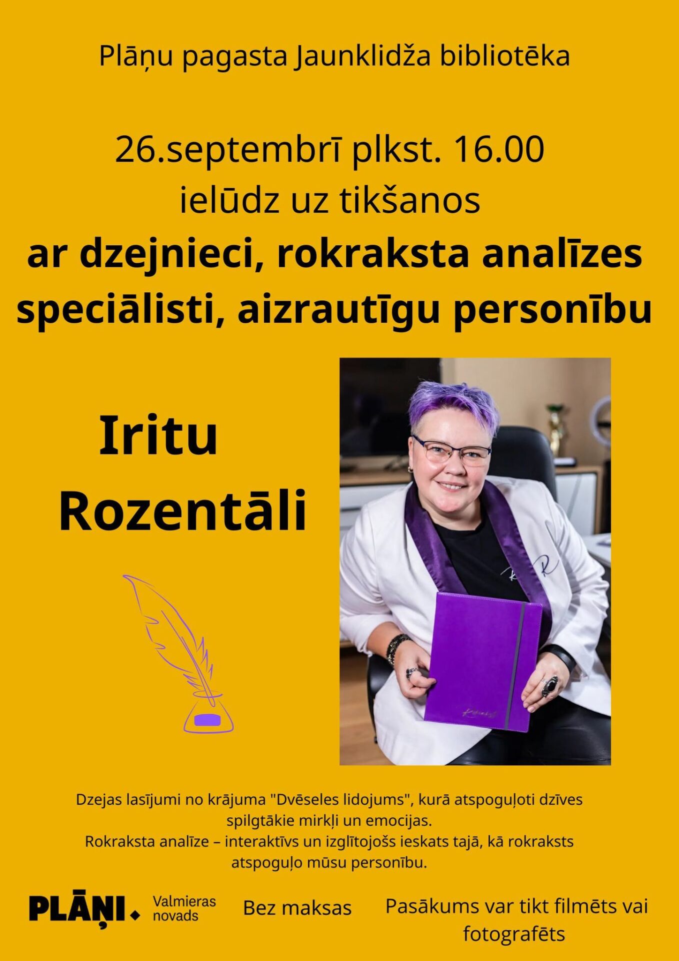 26. septembrī plkst. 16.00 Plāņu pagasta Jaunklidža bibliotēkā notiks tikšanās ar Iritu Rozentāli – dzejnieci, rokraksta analīzes speciālisti. Pasākuma laikā: dzejas lasījumi un rokraksta analīzes meistarklase. Laipni gaidīti visi interesenti!