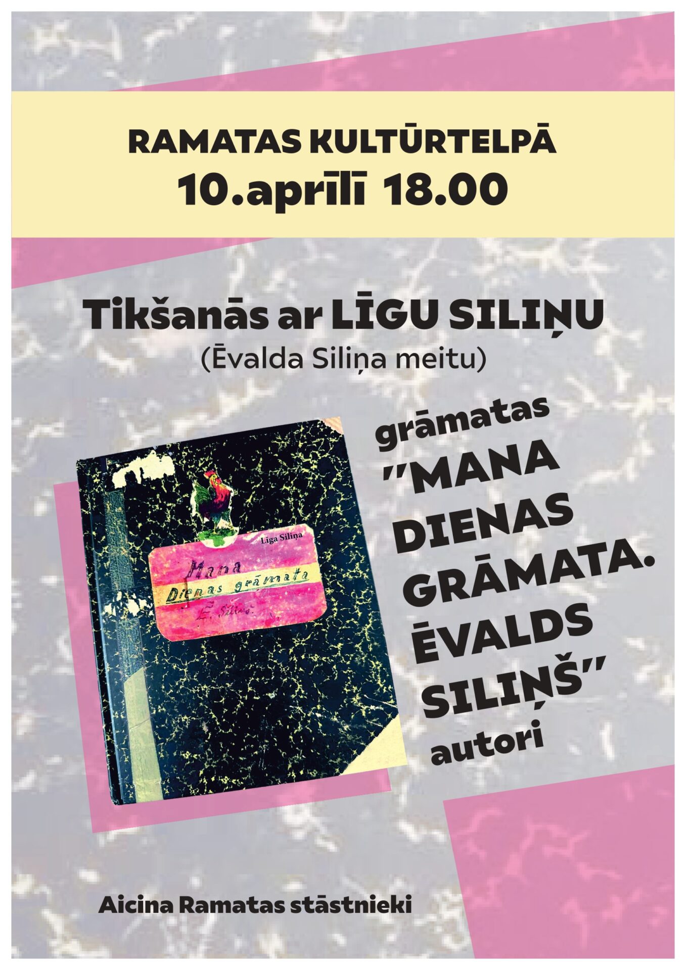Tikšanās ar grāmatas “Mana Dienas grāmata. Ēvalds Siliņš” autori Līgu Siliņu Norises datums: 10.04.2026 10. aprīlī plkst. 18.00 Ramatas Kultūrtelpā tikšanās ar grāmatas “Mana Dienas grāmata. Ēvalds Siliņš” autori Līgu Siliņu. Aicina Ramatas stāstnieki.