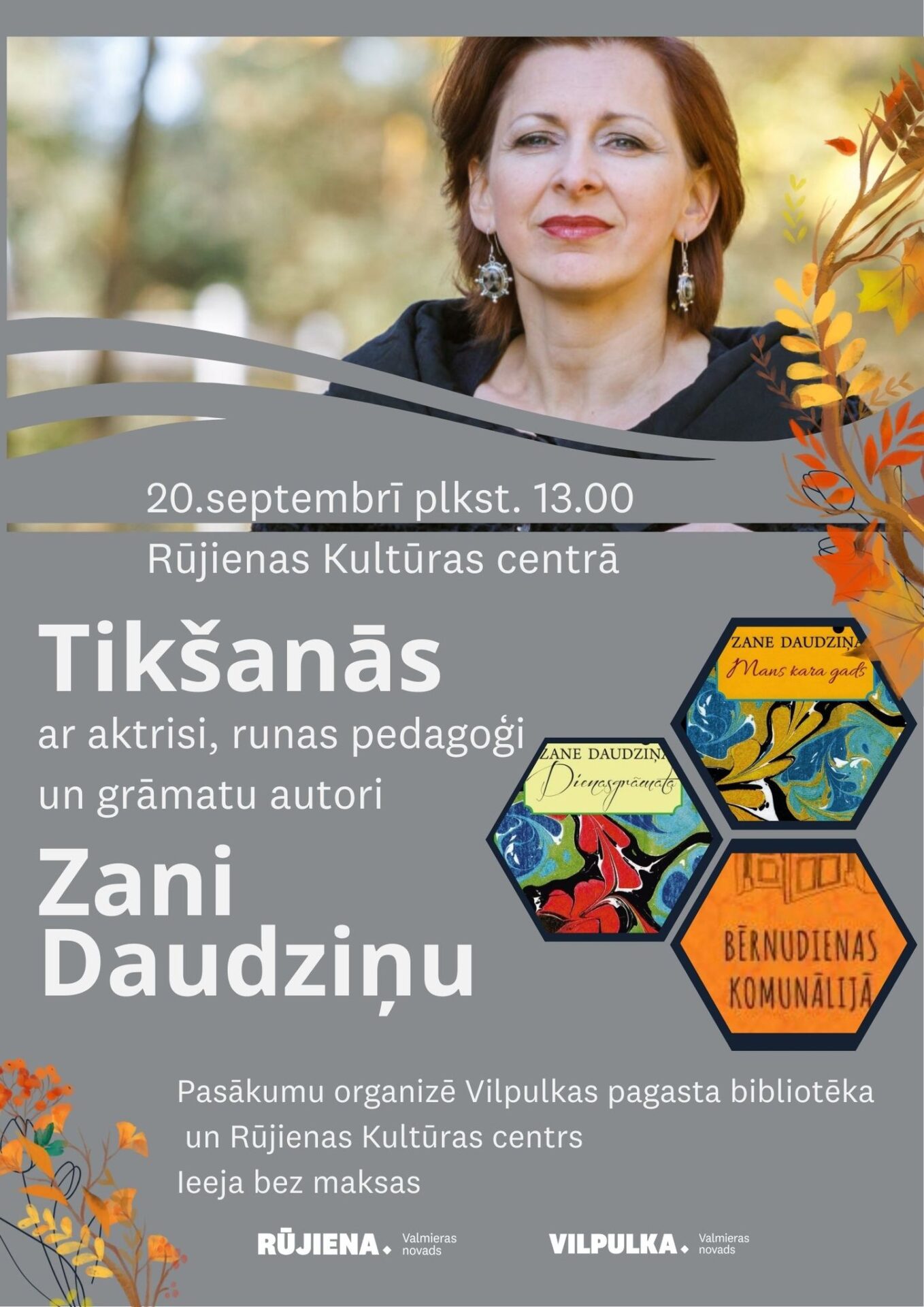 Tikšanās ar Zani Daudziņu Norises datums: 20.09.2025 20. septembrī plkst. 13.00 Rūjienas kultūras centrā tikšanās ar aktrisi, runas pedagoģi un grāmatu autori Zani Daudziņu. Pasākumu organizē Vilpulkas pagasta bibliotēka sadarbība ar Rūjienas Kultūras centru.