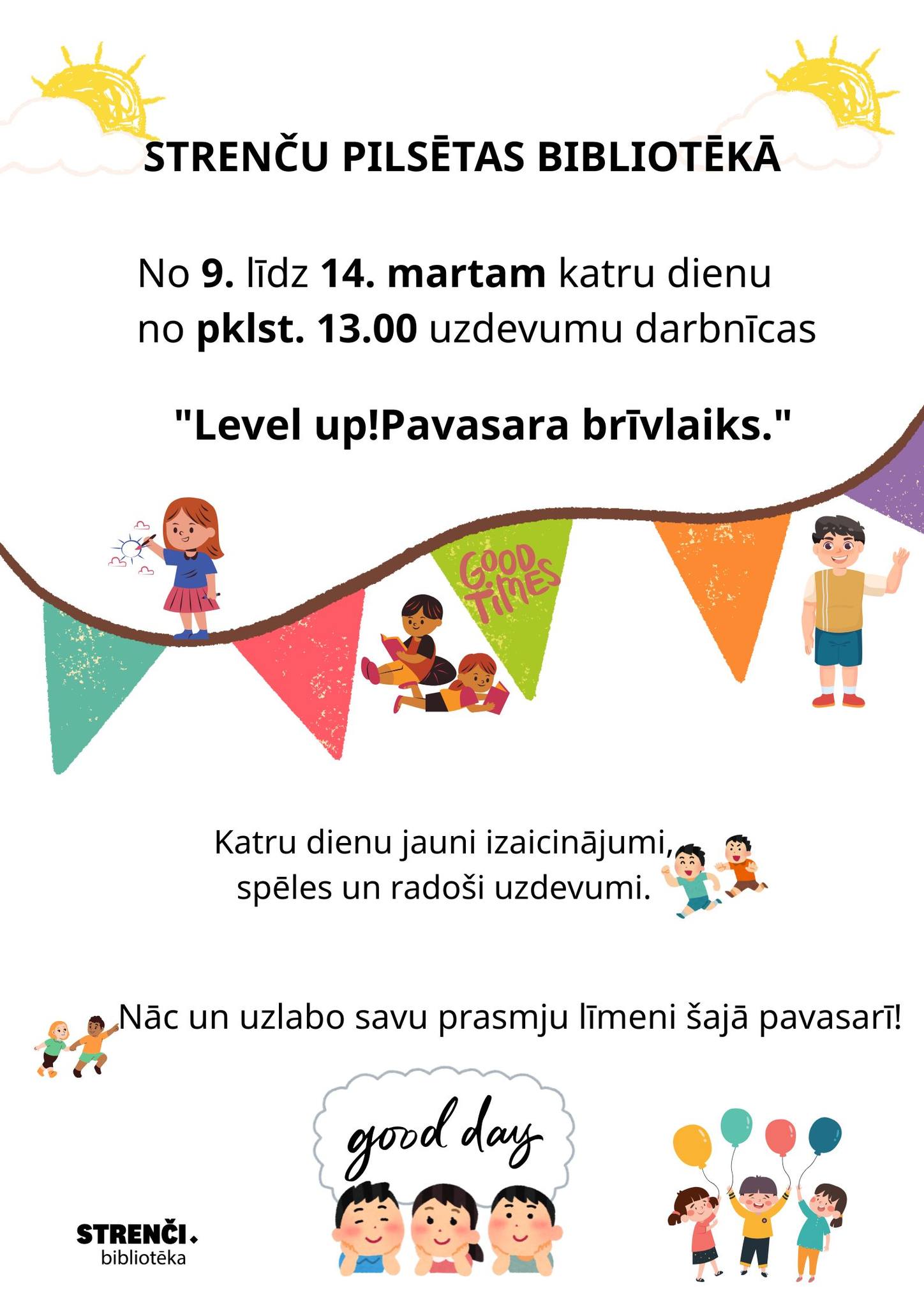 No 9. līdz 13. martam katru dienu no plkst. 13.00 Strenču pilsētas bibliotēkā uzdevumu darbnīcas “Level up! Pavasara brīvlaiks”.