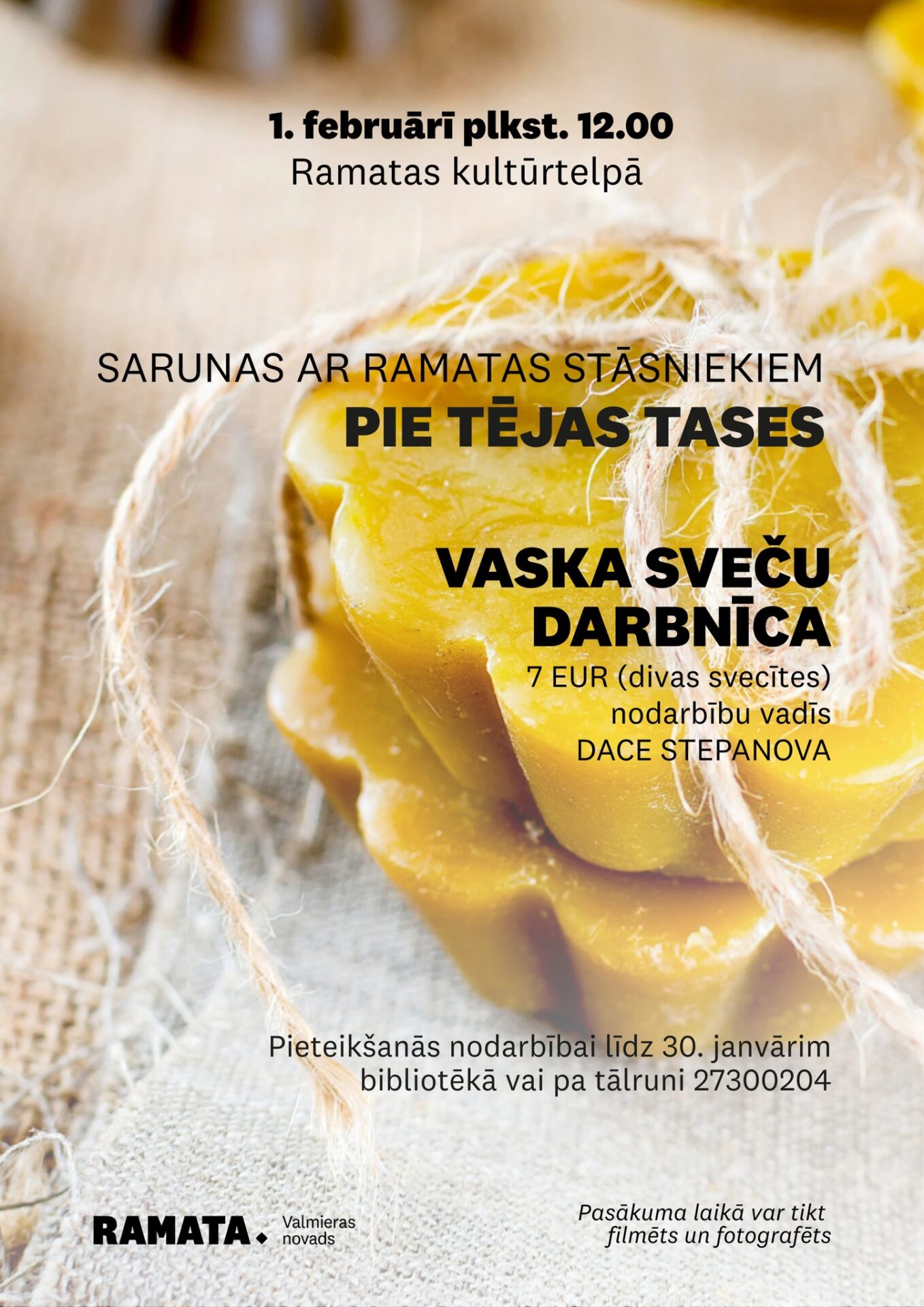 1. februārī plkst. 12.00 Ramatas Kultūrtelpā vaska sveču darbnīca (7 EUR divas svecītes). Darbnīcu vadīs Dace Stepanova. Dalība ar iepriekšeju pieteikšanos līdz 30. janvārim Ramatas pagasta bibliotēkas darba laikā vai zvanot pa tālr. nr. 27300204. Sarunas ar Ramatas stāstniekiem par ekspedīcijās iegūtajiem materiāliem.