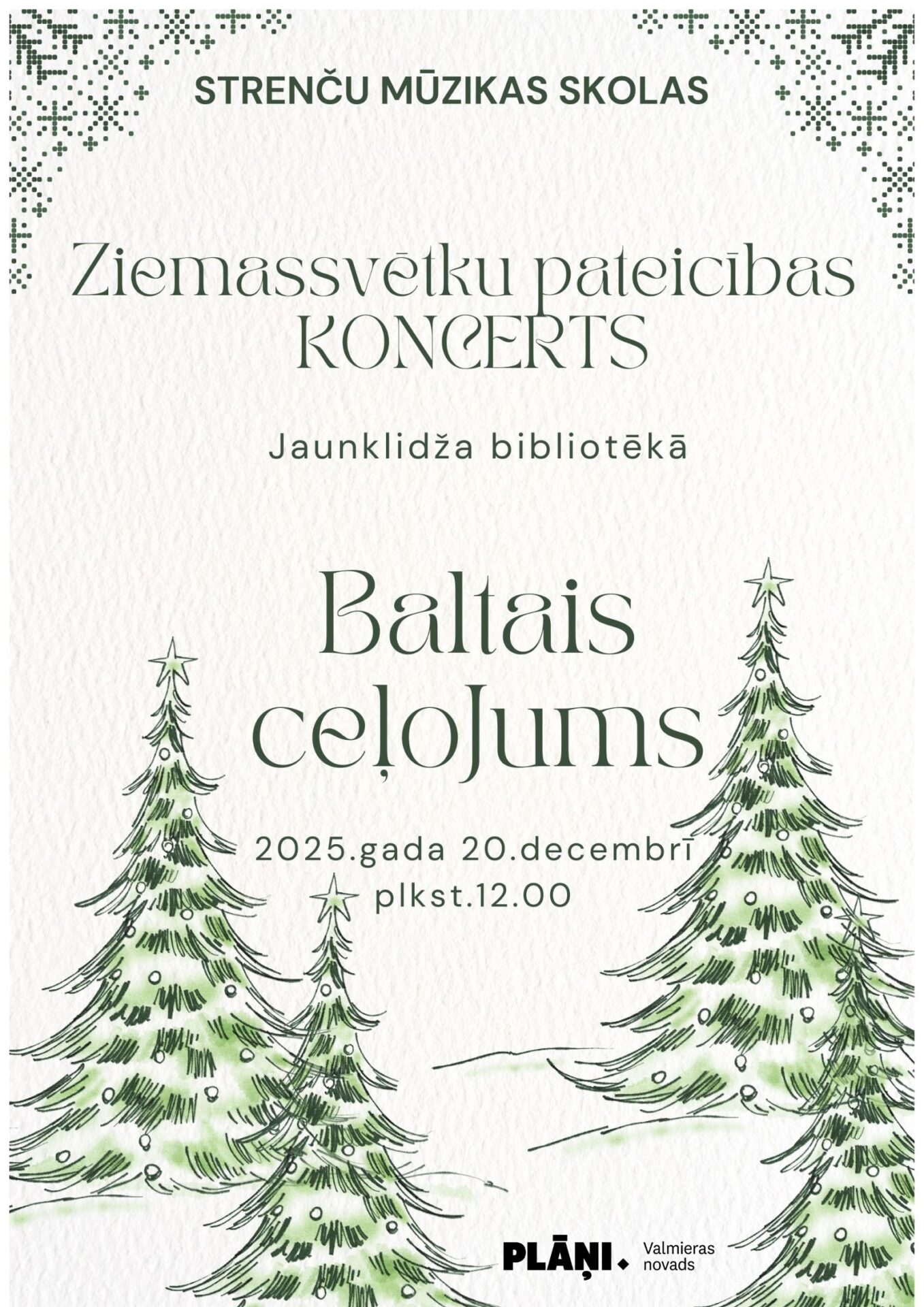 Ziemassvētku pateicības koncerts “Baltais ceļojums” Norises datums: 20.12.2025 20. decembrī plkst. 12.00 Plāņu pagasta Jaunklidža bibliotēkā ar Ziemassvētku pateicības koncertu “Baltais ceļojums” iedzīvotājus iepriecinās Strenču Mūzikas skolas audzēkņi un pedagogi. Visi laipni aicināti!