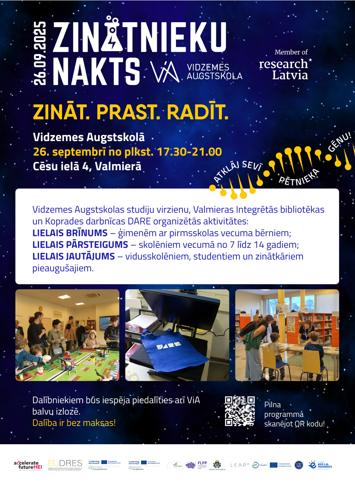 26. septembrī no plkst.17.30 līdz 21.00 Cēsu ielā 4 (visā ēkā) notiks Eiropas Zinātnieku nakts 2025, kas piedāvās iespēju gan maziem, gan lieliem atklāt sevī pētnieka gēnu!