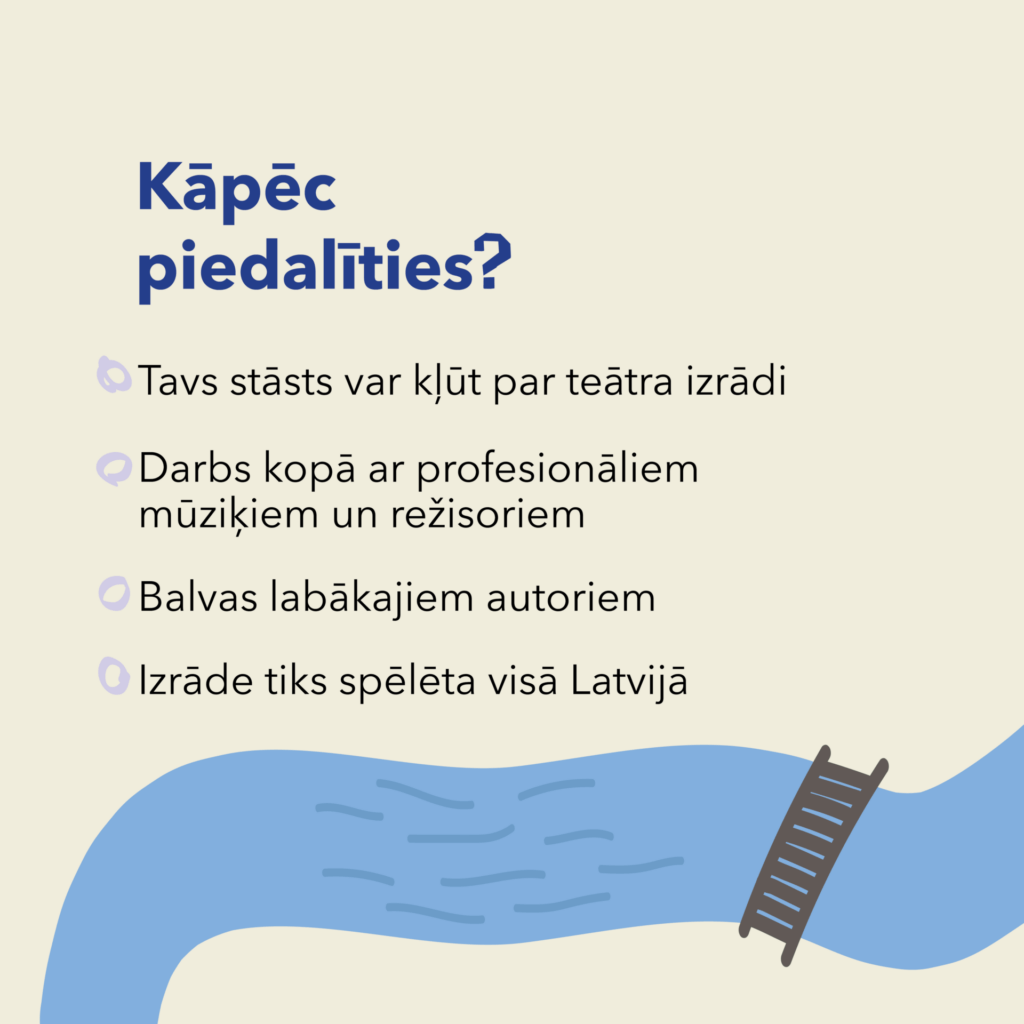 Labākie darbi tiks apbalvoti, savukārt uzvarētāja stāsts kļūs par pamatu profesionālai, dziesmotai teātra izrādei ar oriģinālmūziku, kas vēlāk tiks izrādīta visā Latvijā.
