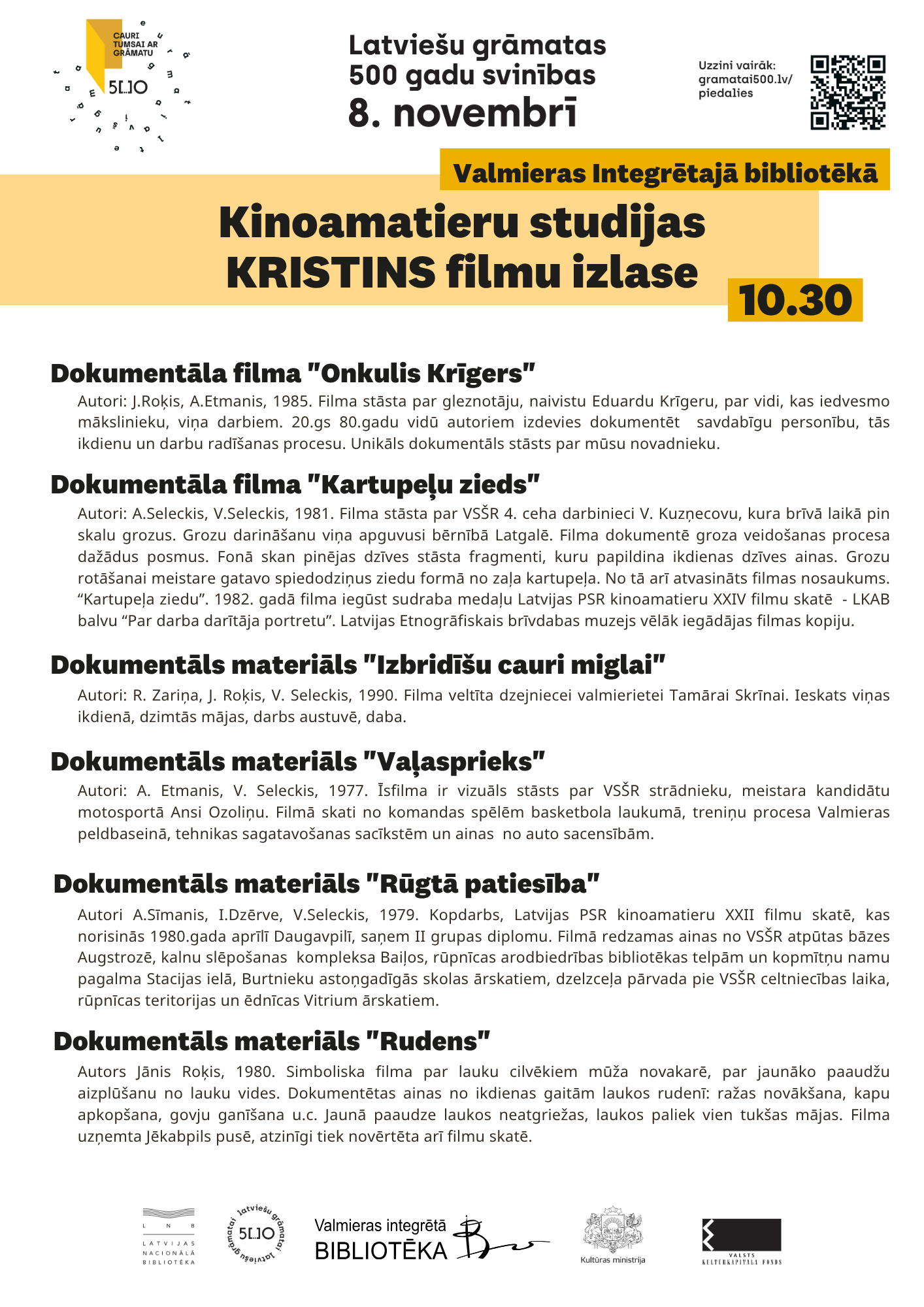 Pasākuma apmeklētājiem bija unikāla iespēja noskatīties Kinoamatieru studijas KRISTINS filmu izlasi. Filmas tika digitalizētas ar LNA Latvijas Valsts kinofotofonodokumentu arhīva atbalstu. Kino seansu īpašu padarīja dzejnieces Tamāras Skrīnas klātbūtne – filma “Izbridīšu cauri miglai” veltīta dzejniecei, filmā atainota viņas ikdiena, dzimtās mājas, dzejoļu krājuma “Dzintars asiņo” iznākšana.