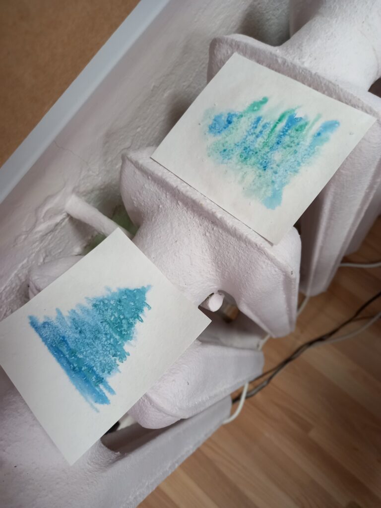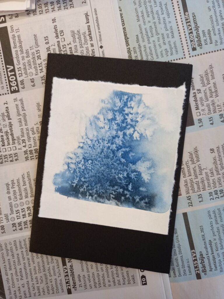 Pludinot akvareļkrāsas, gleznojām mazas eglītes. Akvareļkrāsām pārberot sāli, gleznojumā rodas interesantu faktūru efekts, kas vizuāli atgādina sniegotu egli. Tā tās sasniga – zaļas, zaļizilas un zilas. Interesants moments, ko izmantot dažādu Ziemassvētku apsveikumu veidošanai.