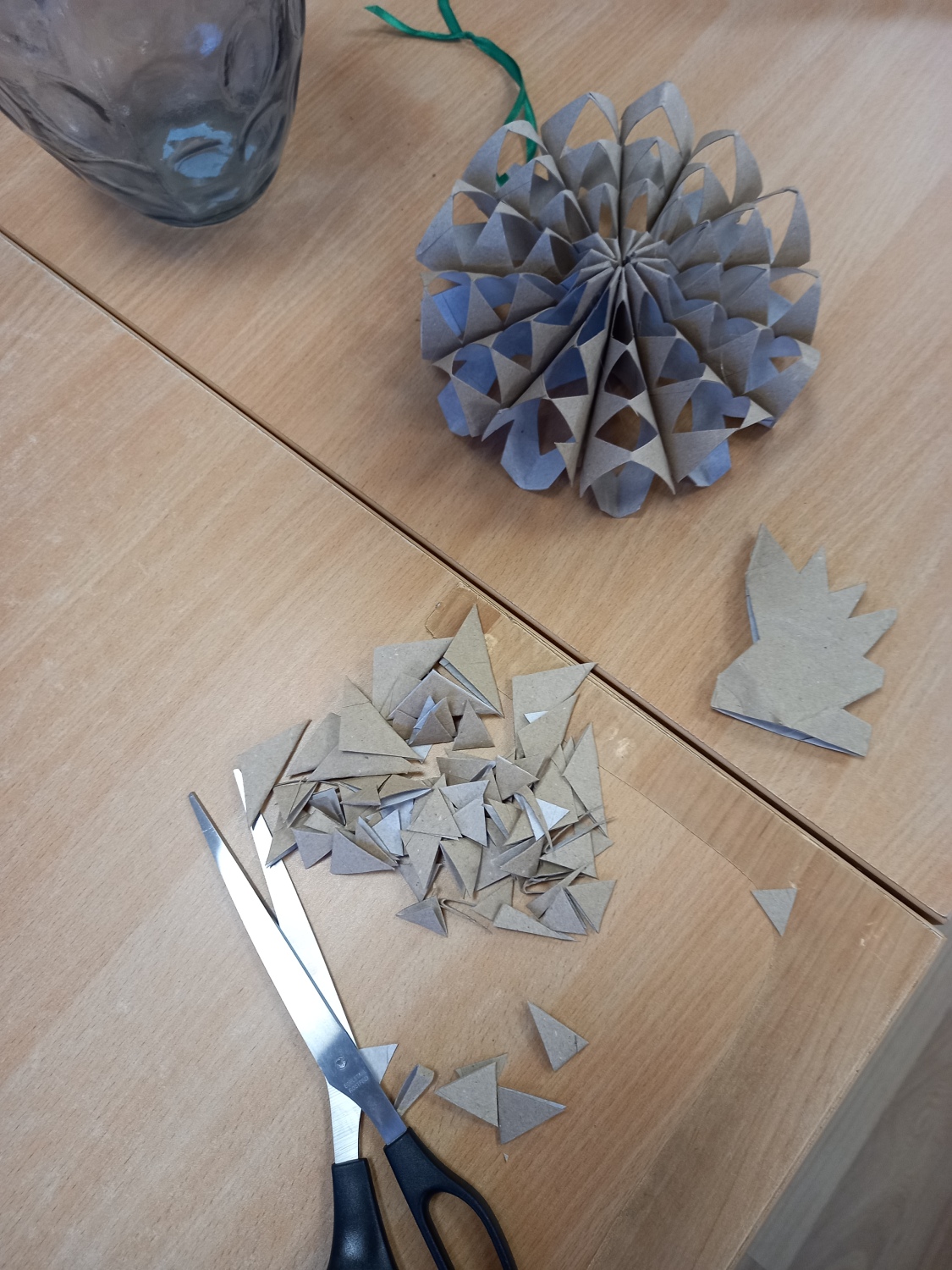 Vai mēs zinājām par iespēju izmantot tualetes papīra kartona rullīšu pamatnītes telpisku sniegpārslu – eglīšu un interjera dekorēšanai? Izrādās, ir tik vienkārši tos saplacināt, izgriezt robiņus, salīmēt un telpiski izvērst. Rodas tik efektīgs rotājums, kuru var atstāt kartona krāsā, taču, ja ir vēlēšanās, nopūst baltu, zilu, sudrabainu vai zeltītu. Vienreizējs skaistums… un pārsteigums.